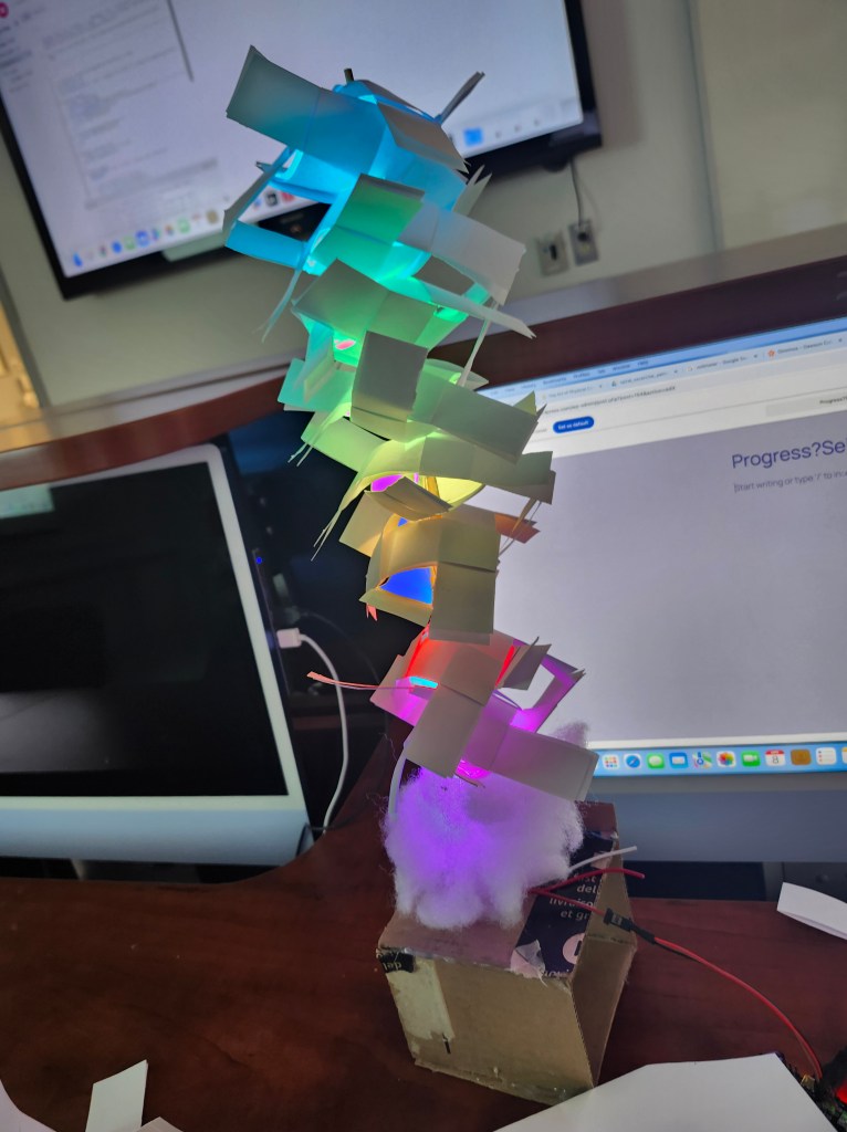 I think a more fitting title would be paper tower but alas rocket is what we went with. It’s a light sculpture made of individual pieces of paper